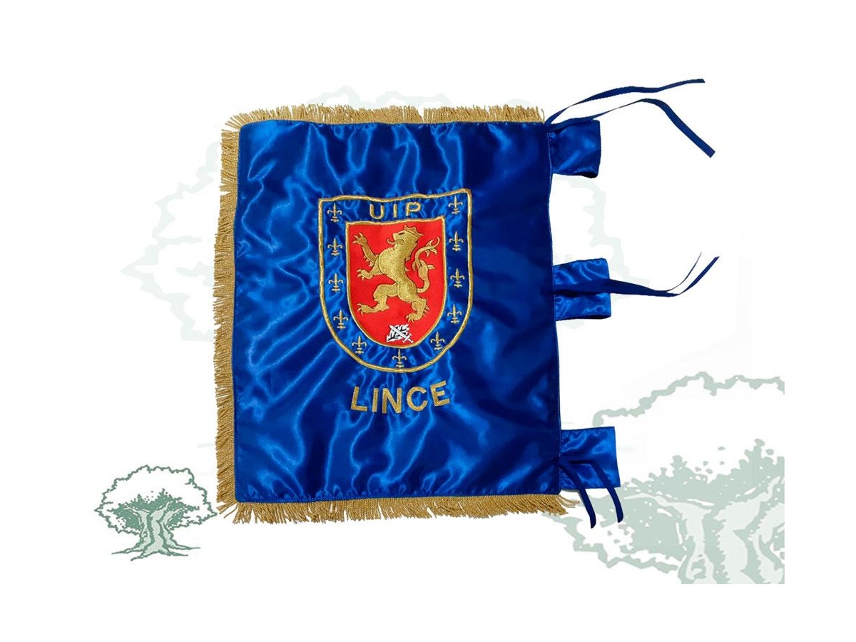 Bordado a doble cara con tela de raso especial y en hilos de oro, según indica la normativa, con estructura general única, forma rectangular, de 600 milímetros de vaina por 65 milímetros de vuelo con flecos dorados.