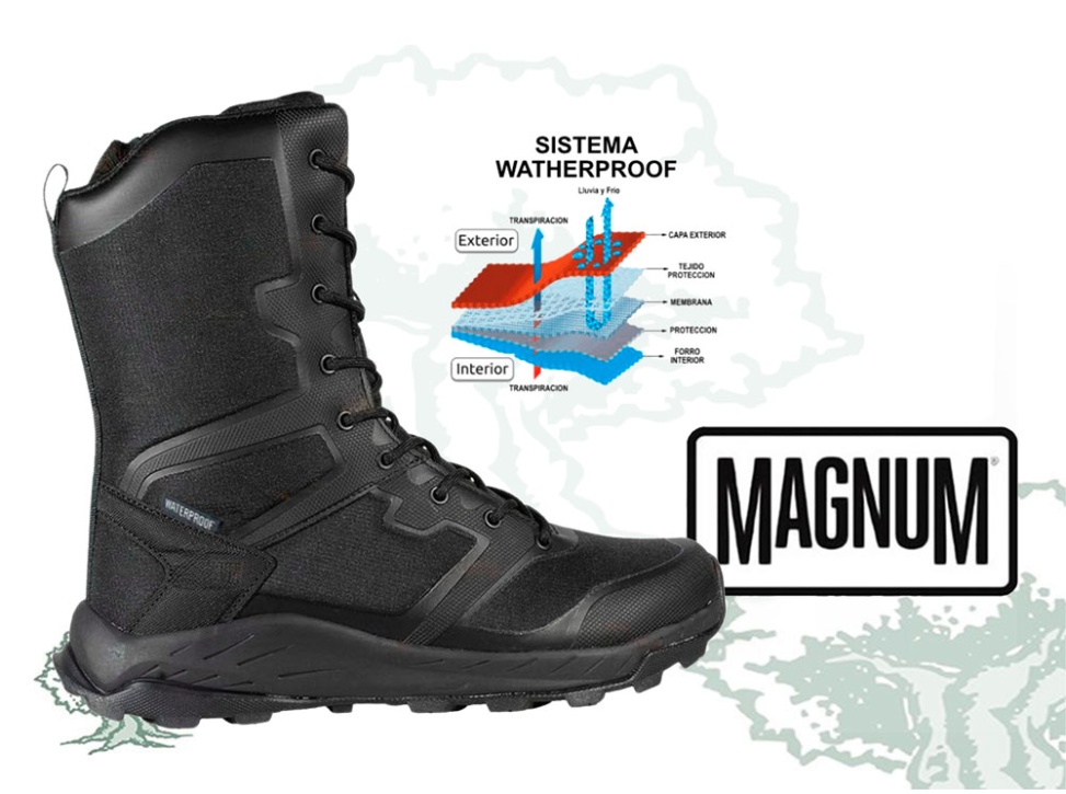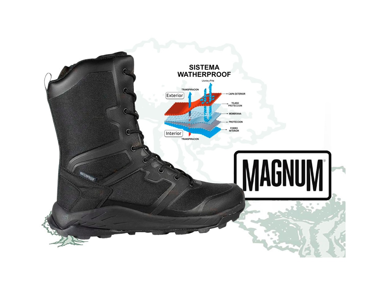 Las Magnum Mega Tactical Hi Plus WP son botas tácticas de alto rendimiento, especialmente diseñadas para profesionales que trabajan en condiciones climáticas extremas. Gracias a su membrana impermeable y transpirable Dri-Tec®, ofrecen una protección total frente a la humedad sin comprometer la transpirabilidad.