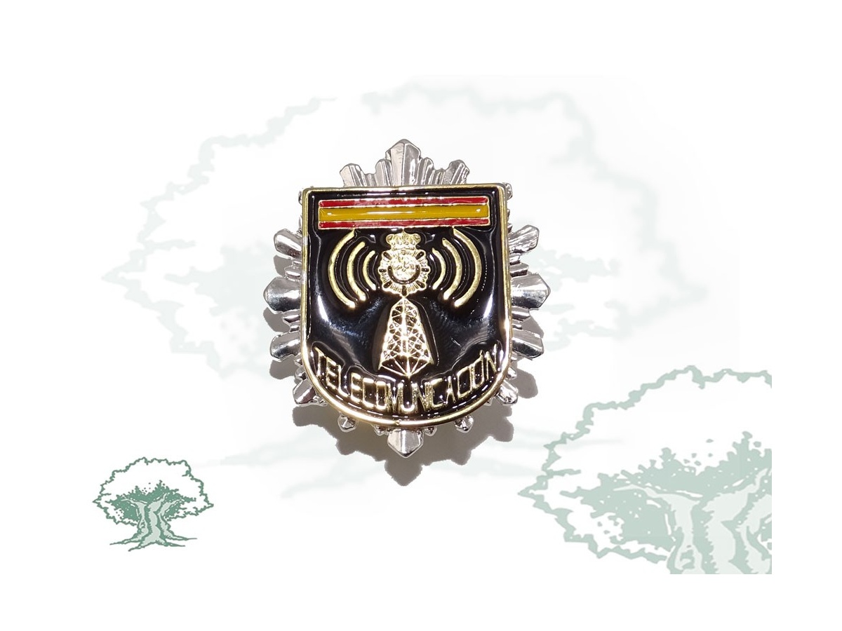 En el centro, un Escudo Español con campo esmaltado en negro y fileteado en dorado conteniendo en la parte superior la bandera de España, el centro una torre de comunicaciones con ondas de radio y rematando la redondez del escudo la leyenda "TELECOMUNICACIÓN". En la parte exterior del escudo, rodeándolo y saliendo del mismo un rafagado, en esmalte de color plata.