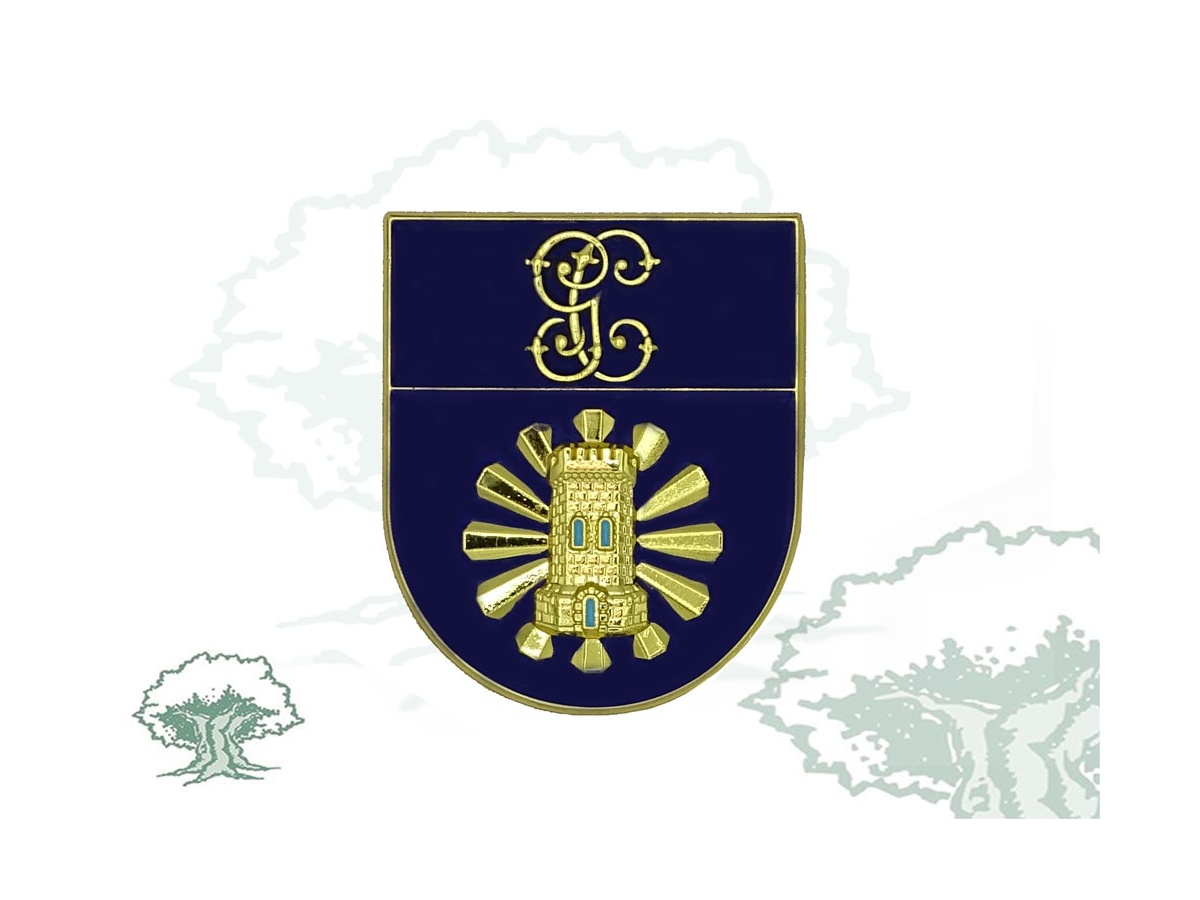 Escudo español cuadrilongo de 30x25 milímetros fileteado de oro. En campo de azur, un sol formado por doce haces de tres rayos dorados cada uno y sobre éste una torre de vigilancia. El jefe de azur cargado con las letras G y C de oro entrelazadas.