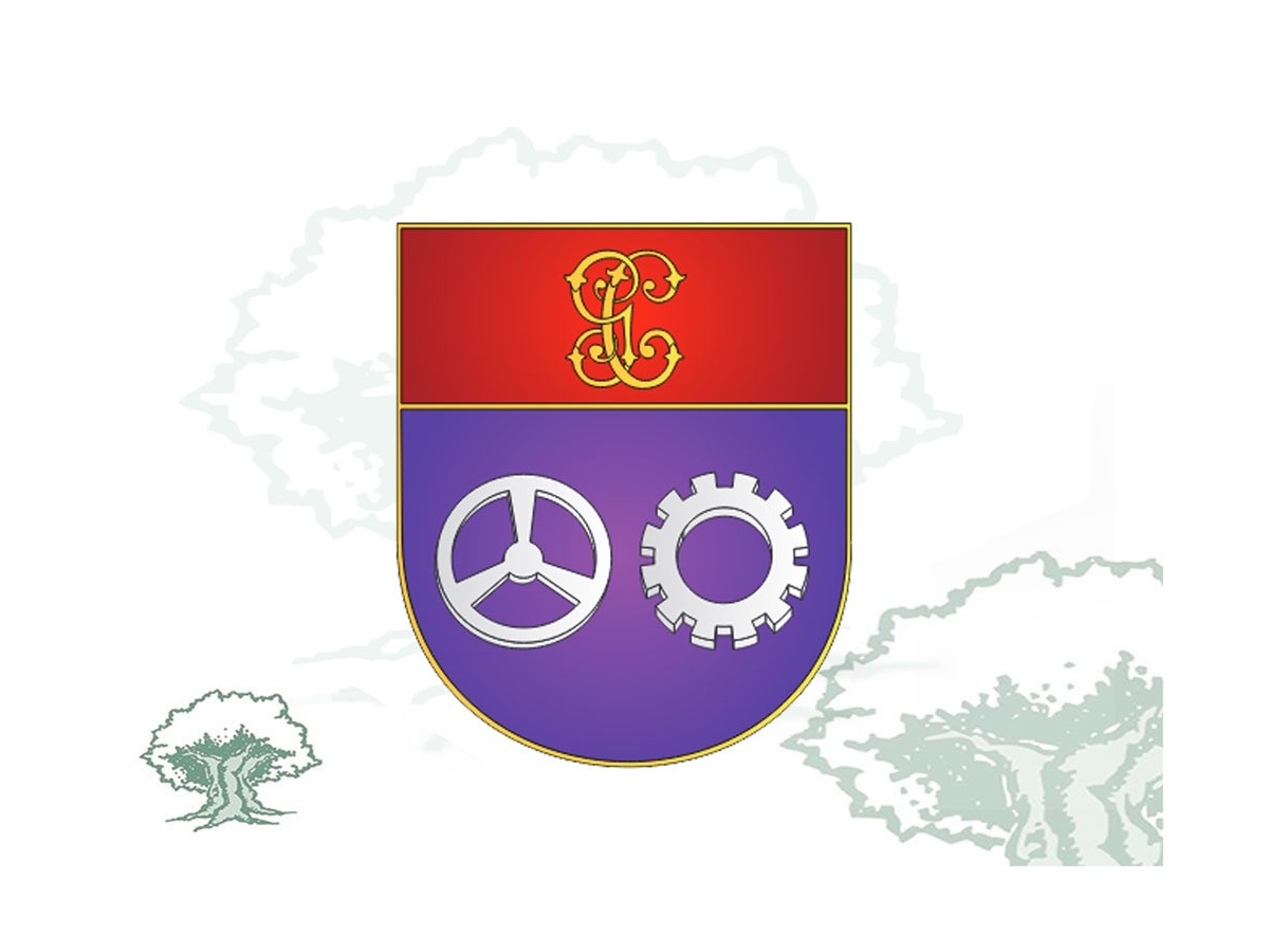 Escudo español cuadrilongo de 30 x 25 milímetros fileteado de oro. En campo de púrpura un volante y una rueda dentada acolados y ambos de plata. El jefe de gules cargado de las letras G y C, de oro, entrelazadas.
