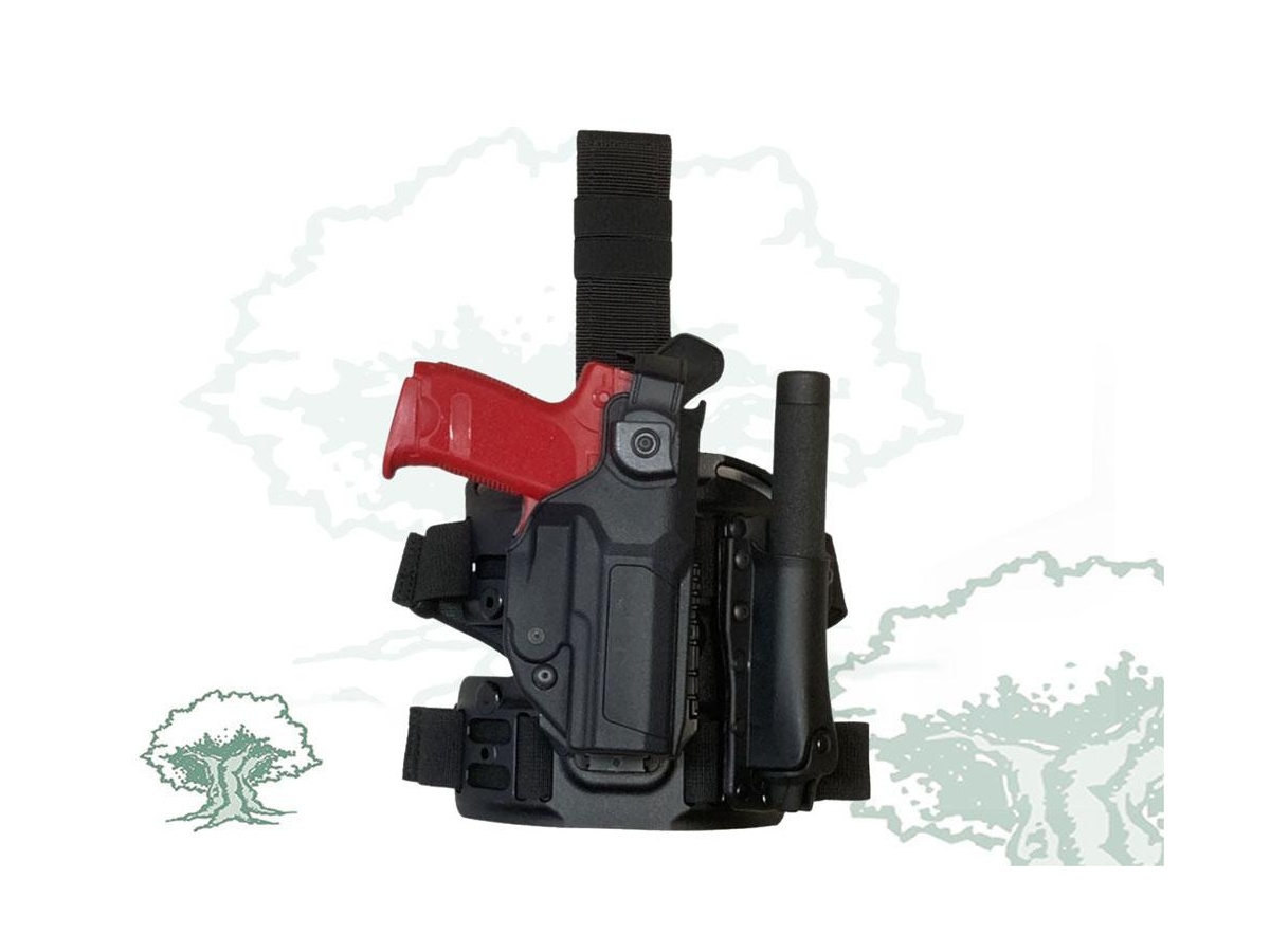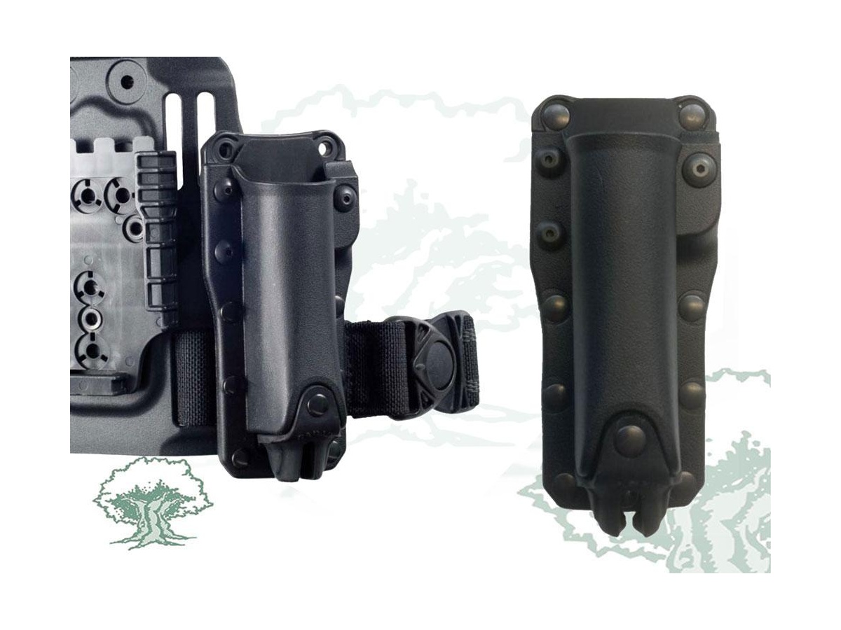 Funda fabricada en polímero para defensa extensible ASP modelo F21 para instalar en pernera Radar. Dispone de ajuste de presión de la funda sobre la defensa. La base de anclaje de la funda en la pernera es ancha para proporcionar mayor estabilidad. En la parte inferior dispone de una apertura de elastómero flexible para en caso de emergencia poder guardar la defensa extendida.