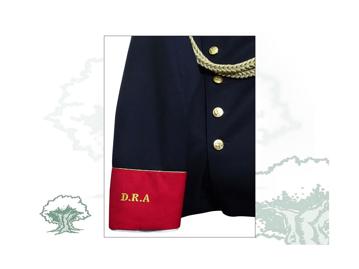 Incluye chaqueta, pantalón, cordón y hombreras de hilo de oro con borlas.