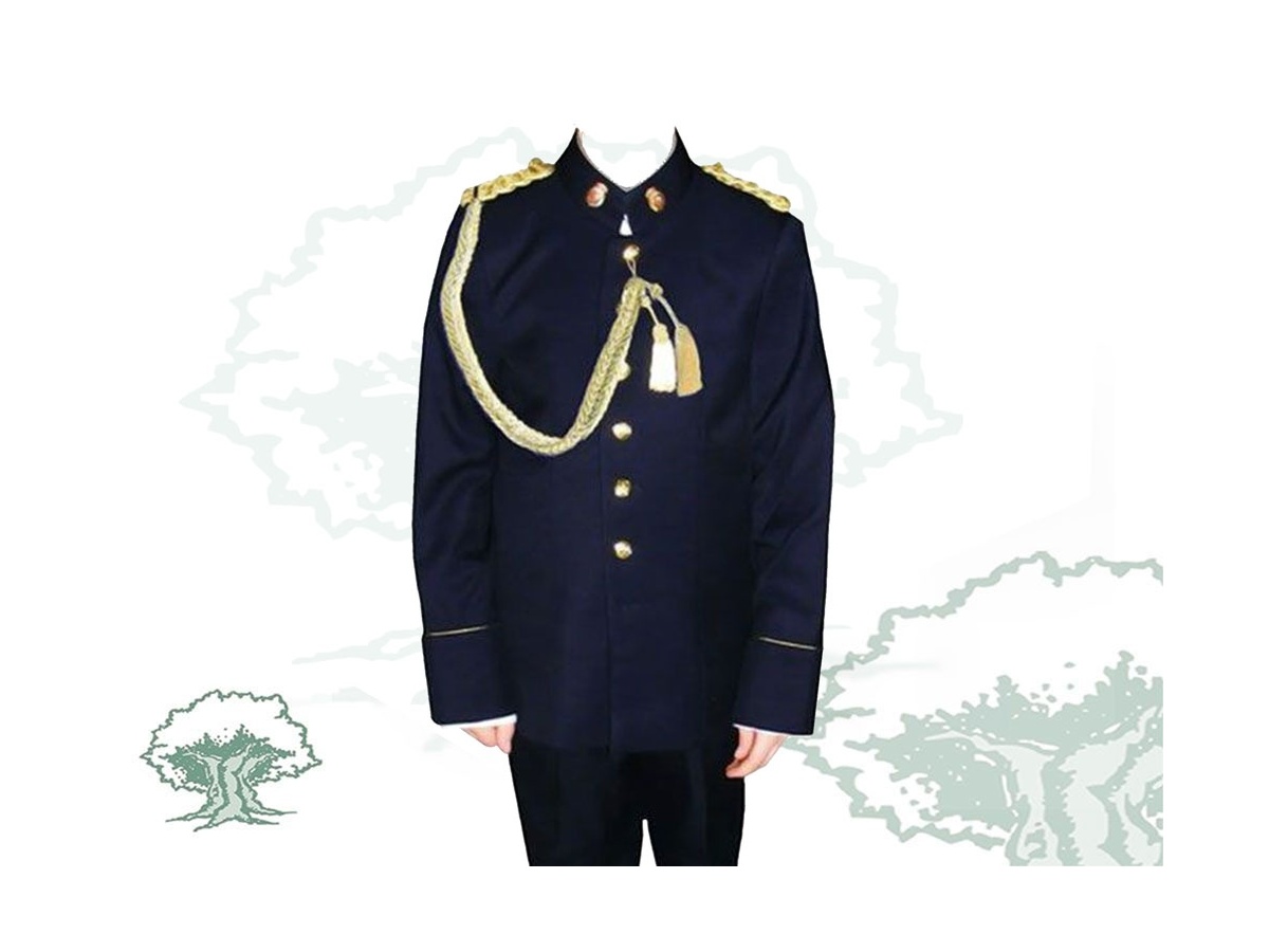 Incluye chaqueta, pantalón, cordón y hombreras de hilo de oro con borlas.