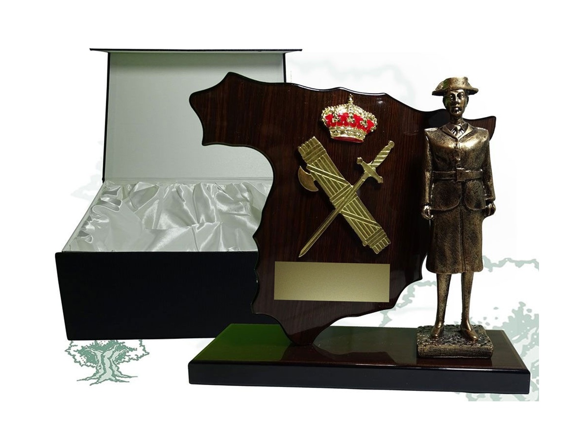 Silueta de España con Emblema Guardia Civil y figura mujer en color bronce.