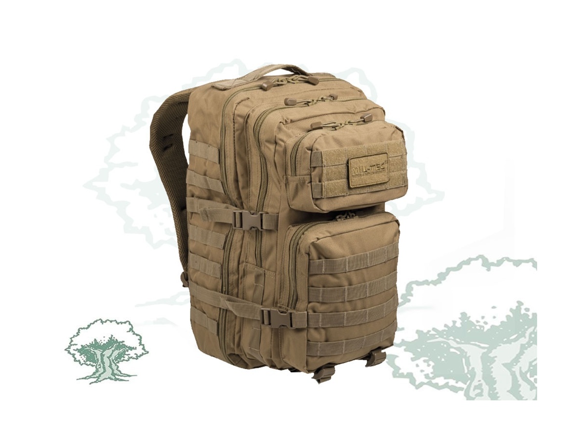 Mochila militar repleta de anclajes MOLLE, con 2 bolsillos exteriores, un bolsillo intermedio, y un compartimento principal de gran tamaño de apertura completa.