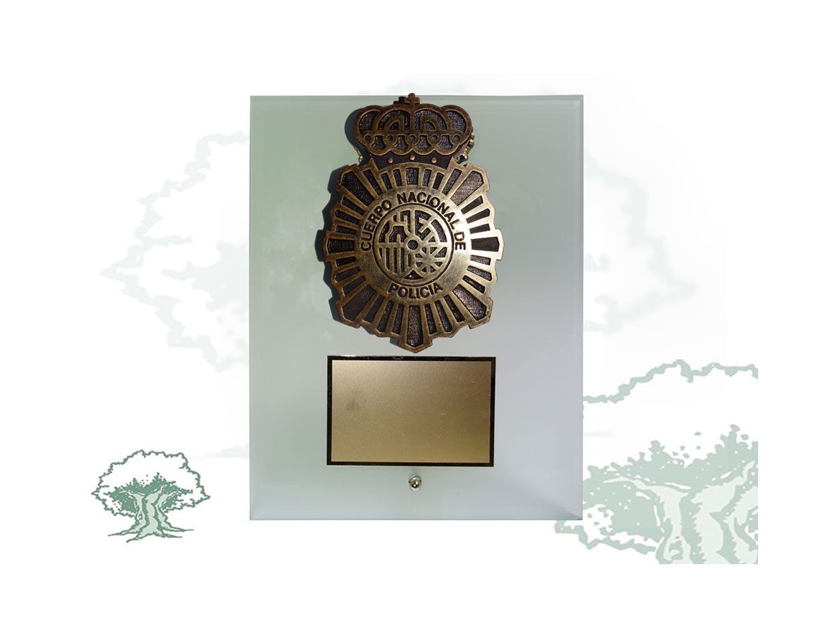 Placa dedicatoria de cristal traslúcido Policía Nacional resina