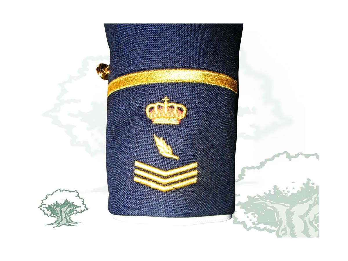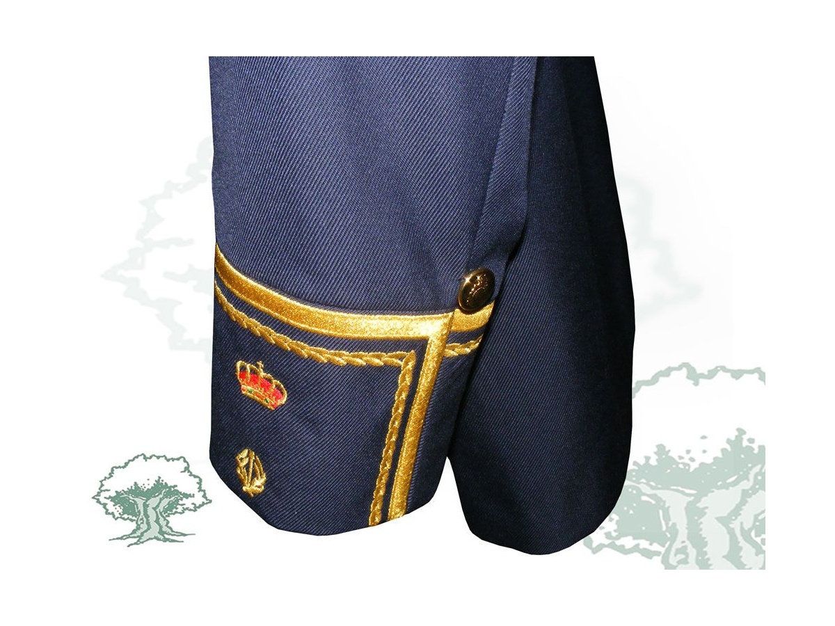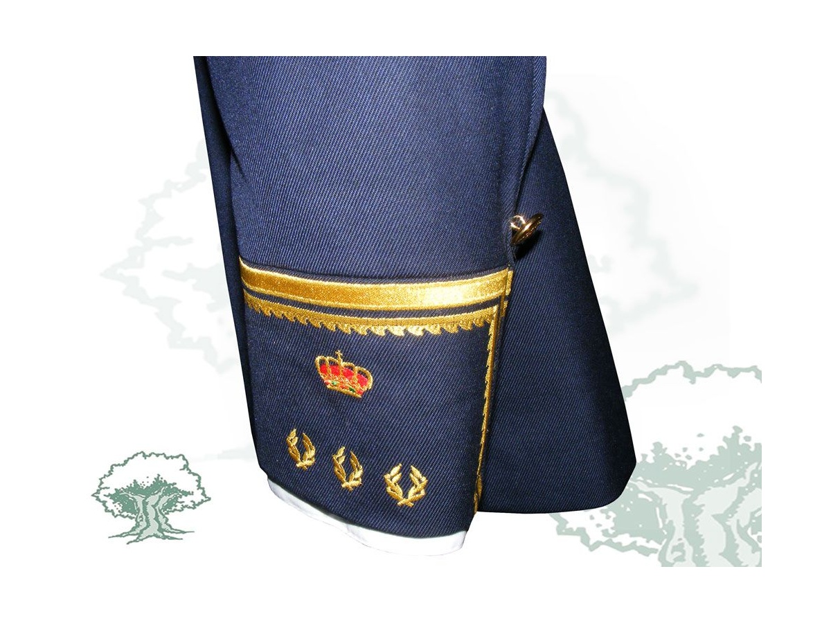 Incluye chaqueta, pantalón, hombreras y cordones en hilos de oro.